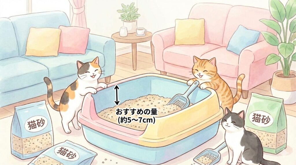 ただし、猫ちゃんの性格やトイレの種類によって、最適な量は変わります。